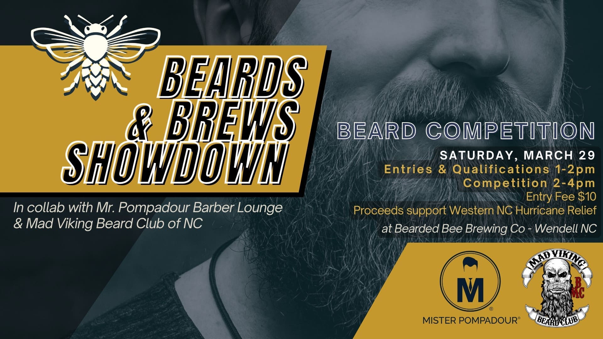 We’re teaming up with Mister Pompadour Barber Lounge and Mad Viking Beard Club of NC for an epic showdown of facial hair greatness—all for a good cause!